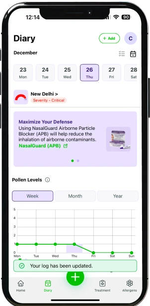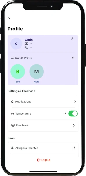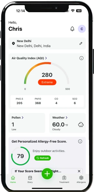 إنّ تحديث أعراض الحساسية لديك بانتظام، والسماح للتطبيق بالوصول إلى موقعك الجغرافي، سيمكّنانك من تلقّي درجة خلو من الحساسية متبصرة تخبرك بمدى جودة تعاملك مع صحتك. تتيح لك هذه الدرجة المخصصة لك شخصيًا إمكانية التحكم، واتخاذ قرارات استباقية، وحماية نفسك وأحبائك من محفزات الحساسية البيئية.